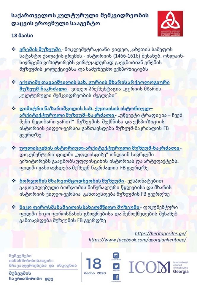 ჩვენს ქვეყანასა და მსოფლიოში განვითრებული მოვლენების გამო 2020 წლის მუზეუმის საერთაშორისო დღე გადადის ციფრულ ფორმატში. ონლაინრეჟიმში გაგაცნობთ სააგენტოს მუზეუმებსა და აქ დაცულ კოლექციებს. იმედი გვაქვს მალე კვლავ შევხვდებით სამუზეუმო სივრცეებში.